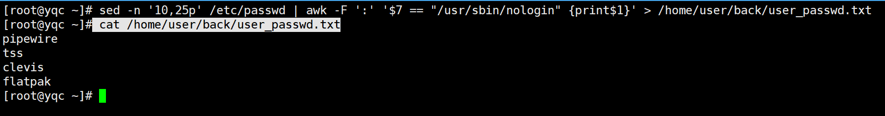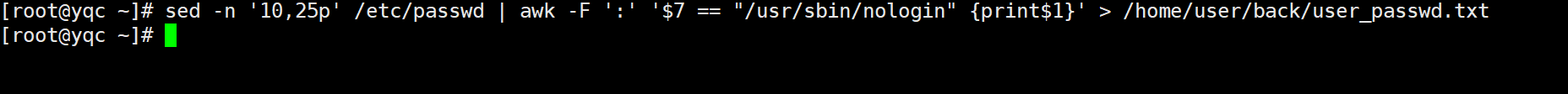 六、统计passwd文件中10行到25行中用户登录的shell是/usr/sbin/nologin的用户名,并将统计的用户名保存到普通用户家目录下的back目录中的user_passwd.txt文件中