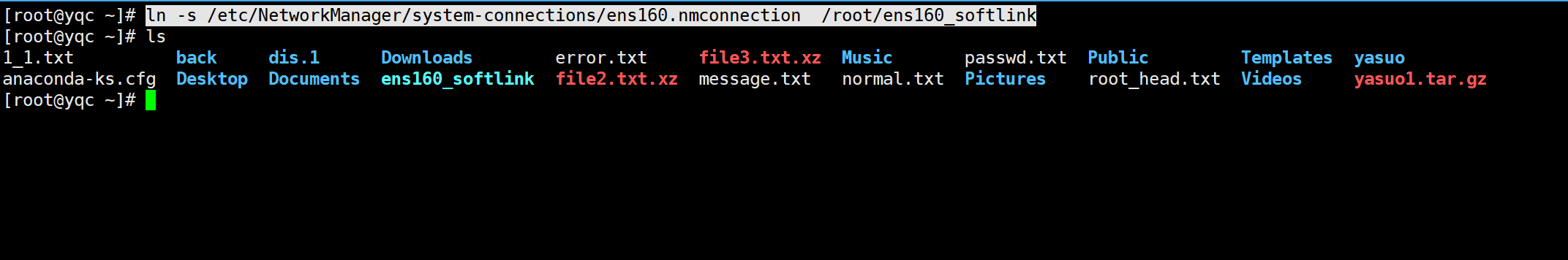 ln -s /etc/NetworkManager/system-connections/ens160.nmconnection /root/ens160_softlink
