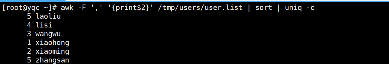 awk -F ',' '{print$2}' /tmp/users/user.list | sort | uniq -c