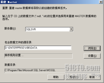 运行该工具,在弹出的重建master窗口中,设置好正确的参数信息:SQL Server服务器,排序规则 以及SQL Server 2000安装文件中master文件所在路径。见下图: