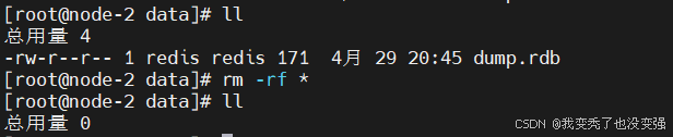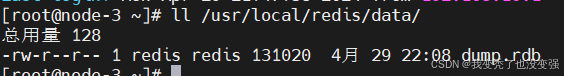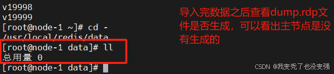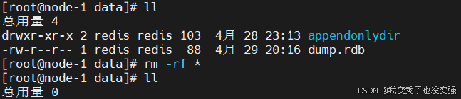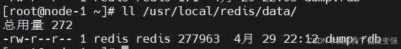 [root@node-1 ~]# ll /usr/local/redis/data/ 查看运行之后主节点和从节点的data下是否产生了rdp文件,都生成了,证明有盘模式验证成功