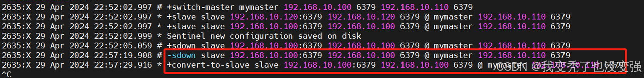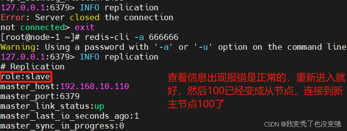 查看新主节点110的信息,可以看到已经成为了master