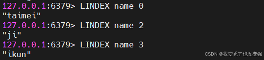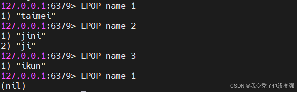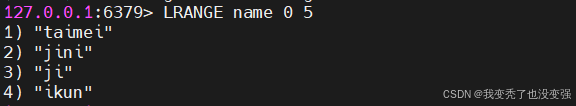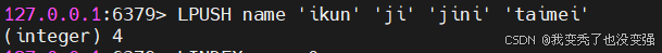 127.0.0.1:6379> LPUSH name 'ikun' 'ji' 'jini' 'taimei'