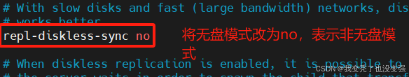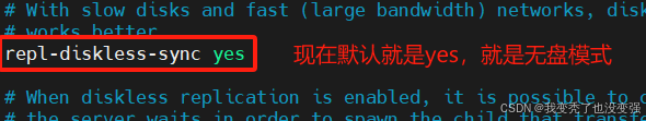 repl-diskless-sync no # 是否使用无盘同步RDB文件,现在默认为yes,no为不使用无盘,需要将RDB文件保存到磁盘后发送给slave, yes为支持无盘,支持无盘就是RDB文件不需要保存至本地磁盘,而且直接通过socket文件发送给slave