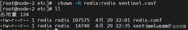 chown -R redis:redis sentinel.conf 为sentinel.conf 更改属主属组