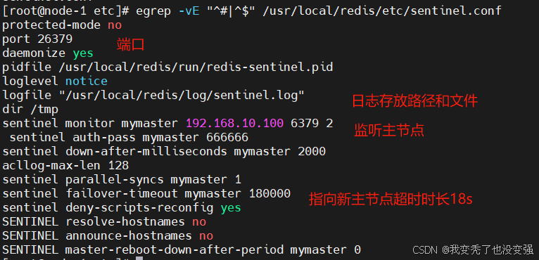 [root@node-1 etc]# egrep -vE "^#|^$" /usr/local/redis/etc/sentinel.conf