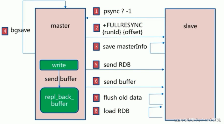 从服务器连接主服务器,发送PSYNC命令,主服务器接收到PSYNC命令后,开始执行BGSAVE命令生成RDB快照文件并使用缓冲区记录此后执行的所有写命令主服务器BGSAVE执行完后,向所有从服务器发送RDB快照文件,并在发送期间继续记录被执行的写命令从服务器收到快照文件后丢弃所有旧数据,载入收到的快照至内存主服务器快照发送完毕后,开始向从服务器发送缓冲区中的写命令从服务器完成对快照的载入,开始接收命令请求,并执行来自主服务器缓冲区的写命令后期同步会先发送自己slave_repl_offset位置,只同步新增加的数据,不再全量同步