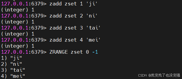 127.0.0.1:6379> ZRANGE zset 0 -1