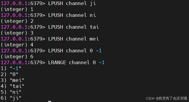 127.0.0.1:6379> LPUSH channel mei