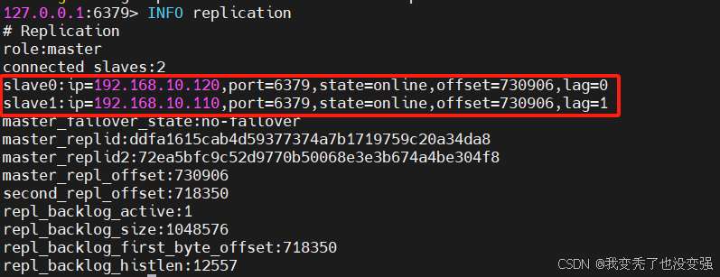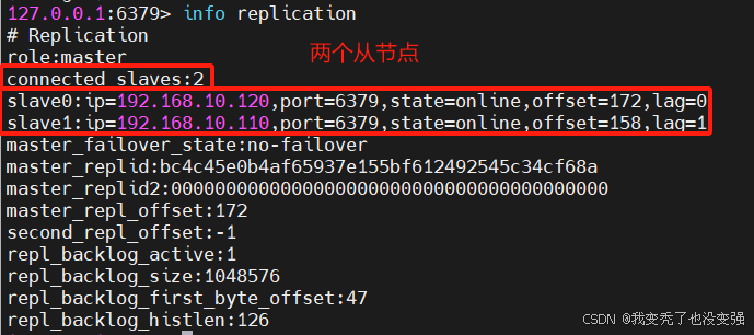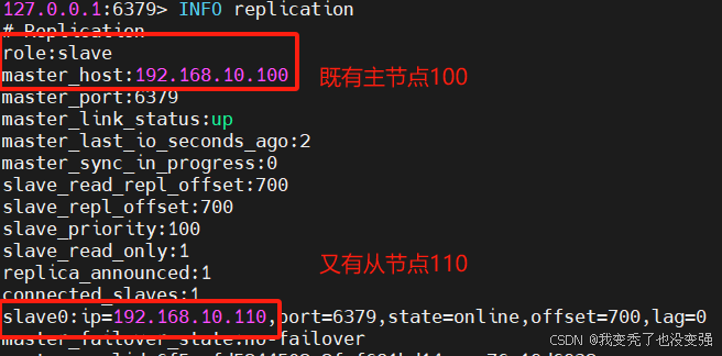 127.0.0.1:6379> INFO replication 可以看到现在100主节点上有两个从节点