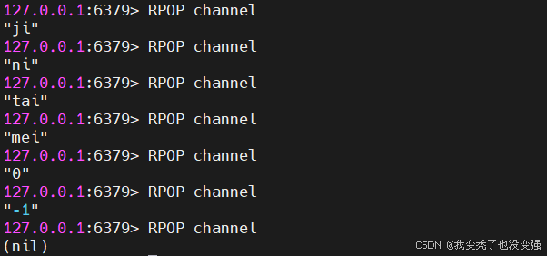 127.0.0.1:6379> RPOP channel 重复取出数据,直到数据取空为止