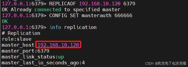 127.0.0.1:6379> REPLICAOF 192.168.10.120 6379