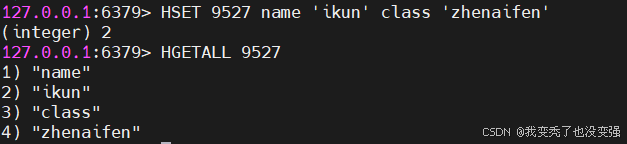 127.0.0.1:6379> HSET 9527 name 'ikun' class 'zhenaifen'