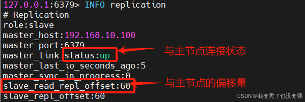 127.0.0.1:6379> INFO replication 查看与主节点连接状态,up是处于连接状态