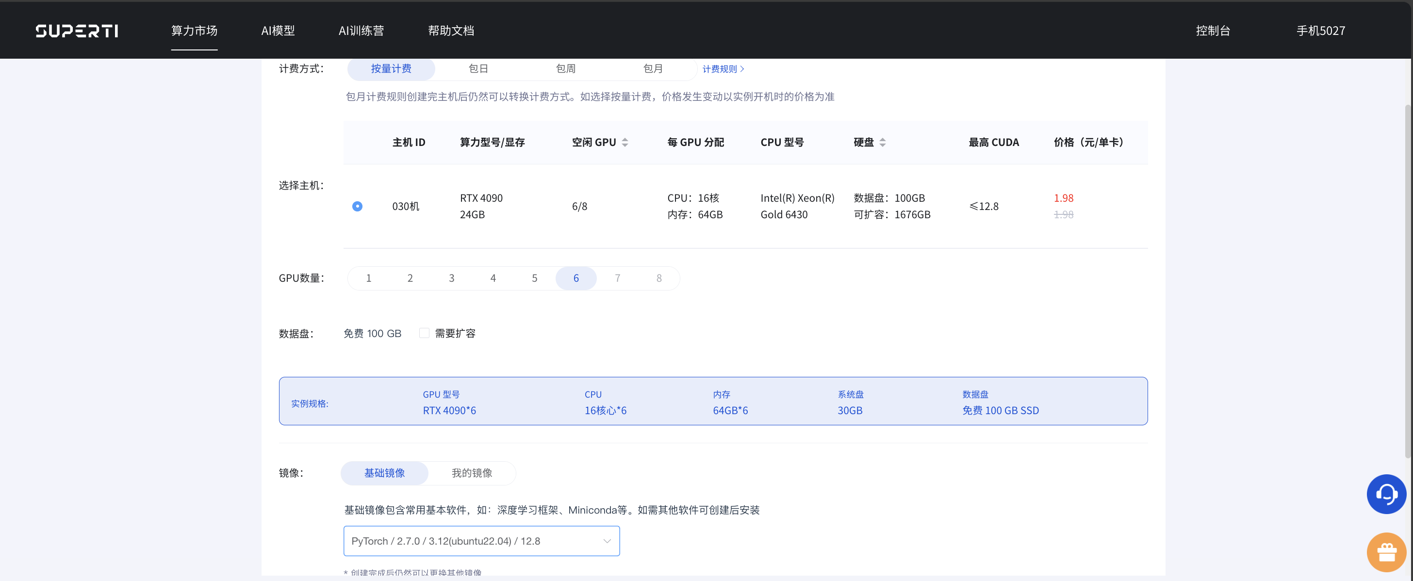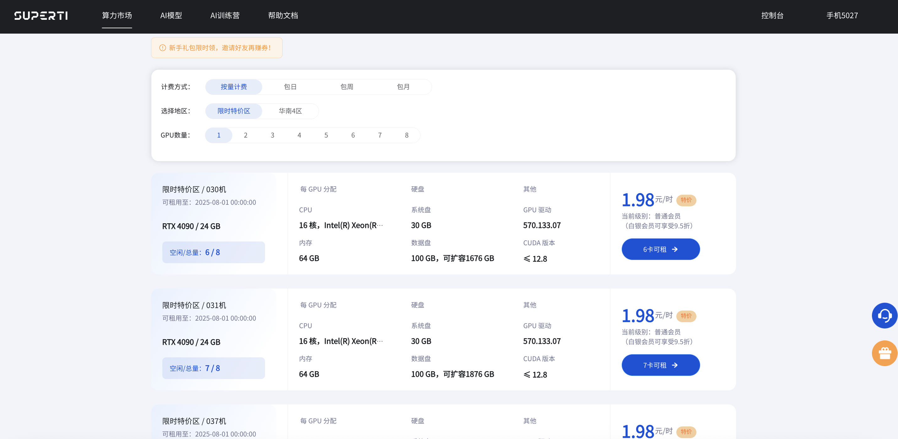 作为实习生,我的“天然优势”就是能快速接入公司自建的AI云平台,关键的是,居然让我薅到了4090的羊毛! 平台上有专门的 “限时特价区”,价格对实习生钱包极其友好(划重点:这个活动目前长期有效!),从连模型都加载不了的1060,到拥有24GB显存的RTX 4090,这算力跃迁,堪称降维打击。