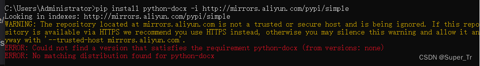 要求使用“--trusted-host mirrors.aliyun.com”允许此警告。