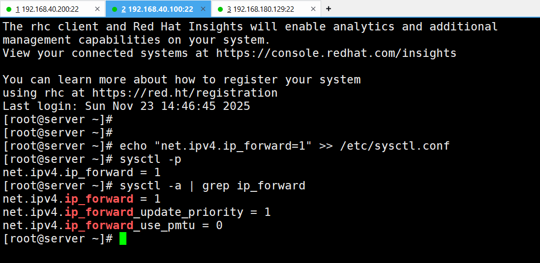 命令:echo "net.ipv4.ip_forward=1" >> /etc/sysctl.conf #开启内核转发功能