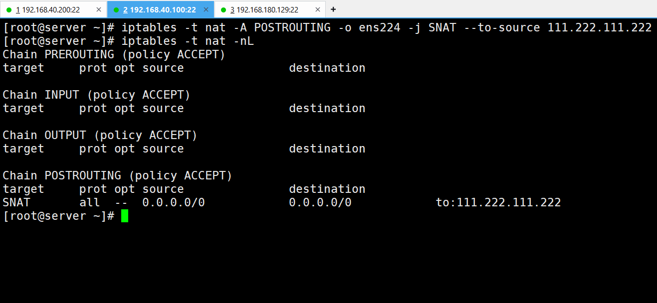 命令:iptables -t nat -A POSTROUTING -o ens224 -j SNAT --to-source 111.222.111.222 #在路由后将源地址转化为111.222.111.222