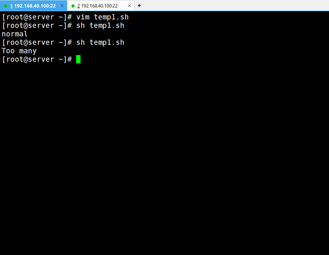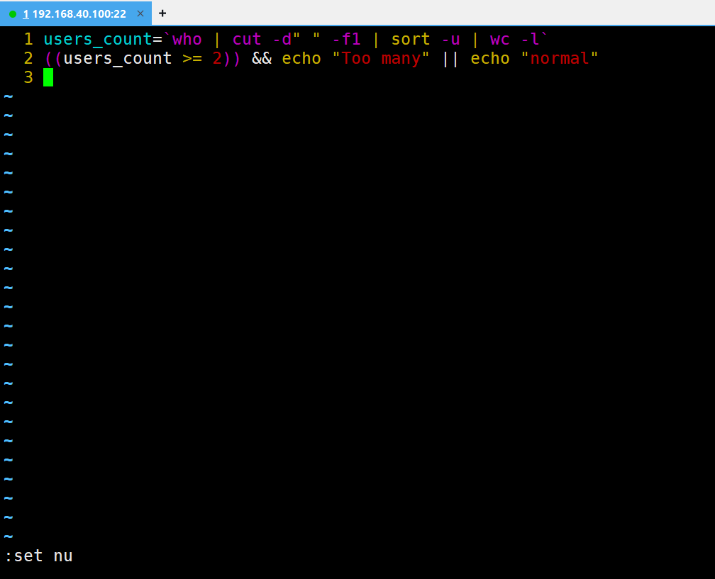 例1:编写脚本temp1.sh ,判断当前系统中已登录账户数,若大于等于2个则输出“Too many” 否则输出" normal"。