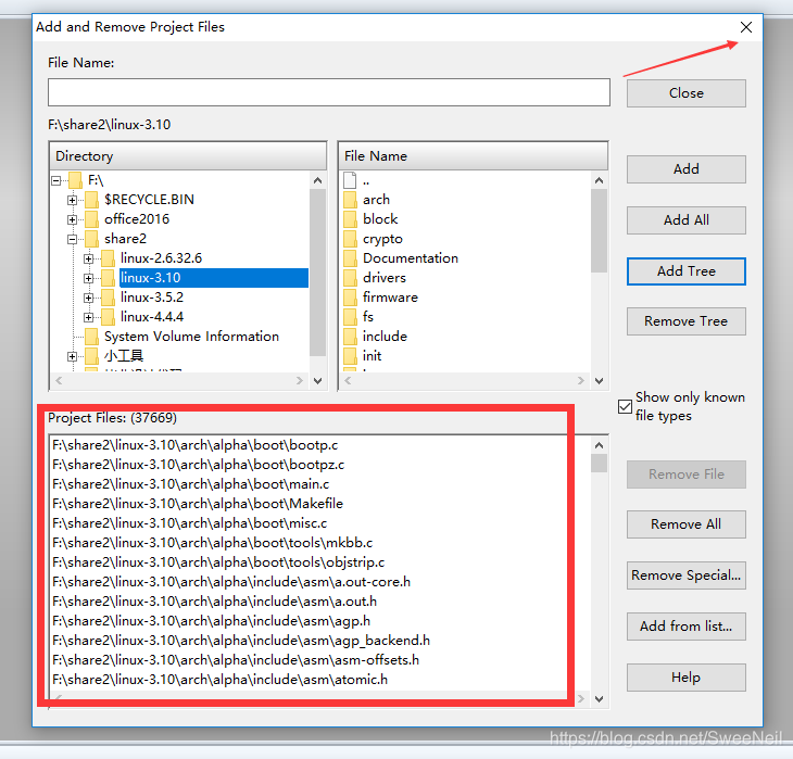点击Add Tree之后后,按照提示,选择确定添加即可,添加完成结果如下图所示,从中可知项目一共包含了37669个文件,然后点击右上角的x