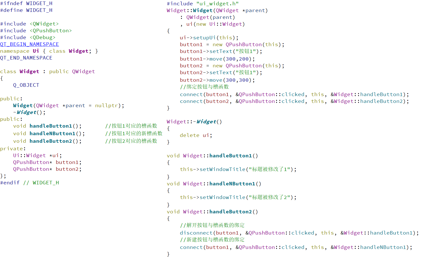 设置两个按钮,按钮1绑定了一个槽函数,当触发按钮2时会重新为按钮1绑定一个新的槽函数。