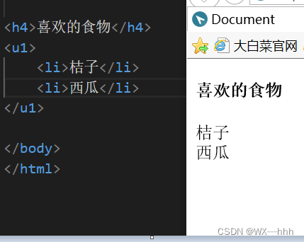 本文展示了一个简单的HTML无序列表示例,其中包括两种水果名称:桔子和西瓜。通过这个例子,读者可以了解如何使用HTML来创建基本的网页结构。