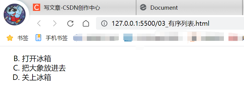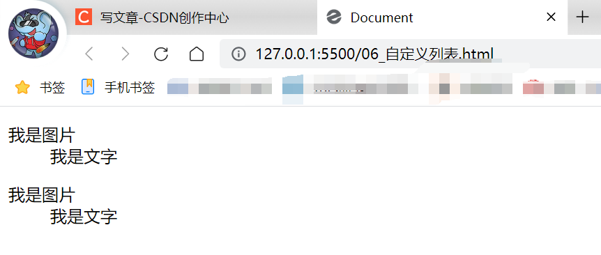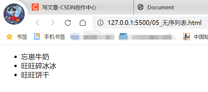 列表无序列表有序列表自定义列表<body> <!-- 1.ul标签里边只能放li标签,但li标签里面可以放其他标签 2.默认的是黑色实心圆 3.type,disc,circle,square,none(用的多) --> <ul> <li>忘崽牛奶</li> <li>旺旺碎冰冰</li> <li>旺旺饼干</li> </ul> </body><body> <!-- 1.li标签里面可以放其他标签,但ol标签只能放li标签 2.数字自动生成 3.type:1,a,A,i,I 4.start:取值只能是一个数字 --> <ol type="A" start="2"> <li>打开冰箱</li> <li>把大象放进去</li> <li>关上冰箱</li> </ol> </body><body> <dl> <dt>我是图片</dt> <dd>我是文字</dd> </dl> <dl> <dt>我是图片</dt> <dd>我是文字</dd> </dl> </body>