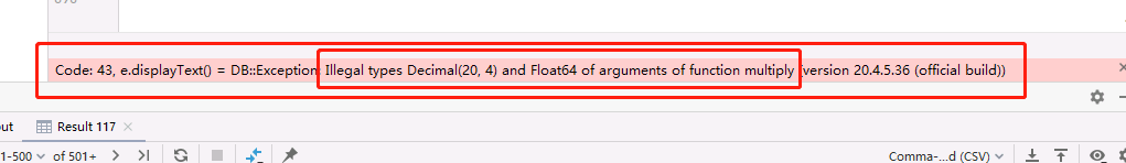 Code: 43, e.displayText() = DB::Exception: Illegal types Decimal(20, 4) and Float64 of arguments of function multiply