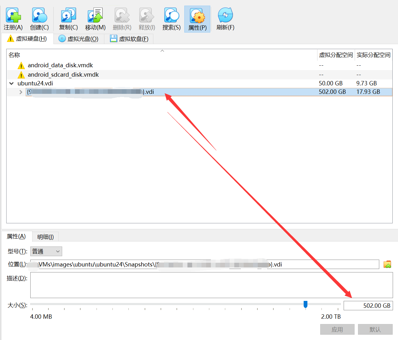 点击应用后这一步就完成了。(别忘了同步调整ubuntu24.vdi部分大小,不然后面执行resize2fs时候会报错)