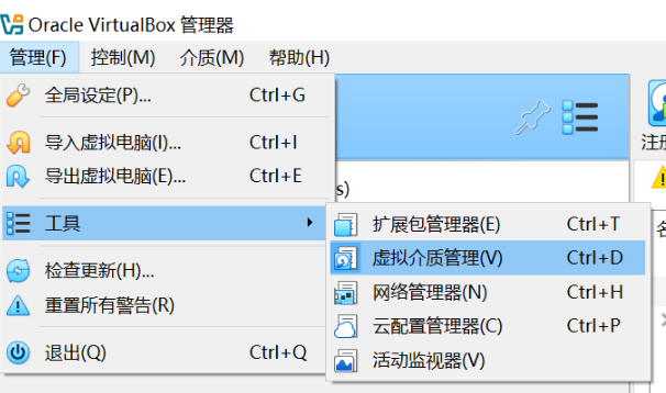 先把虚拟机正常关机。先在主界面选择管理->工具->虚拟介质管理器