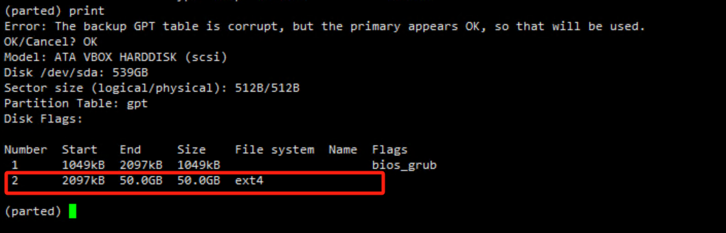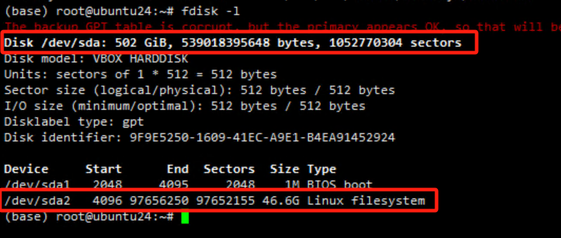 这里检查两个东西,第一个是红框里面的/dev/sda 是你需要操作的盘,第二个查看后面大小是不是你调整后的大小,比如我这里调整为“502GiB”