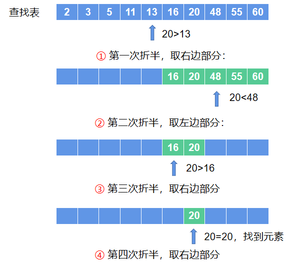 二分查找有称为折半查找找寻数组中的元素,我们需要头下标、中间下标和尾下标,查找的数据大于中间下标上的元素就去中间下标到尾下标之间去查找元素,相反如果小于中间下标上的元素,就去中间下标到头下标之间去查找元素。