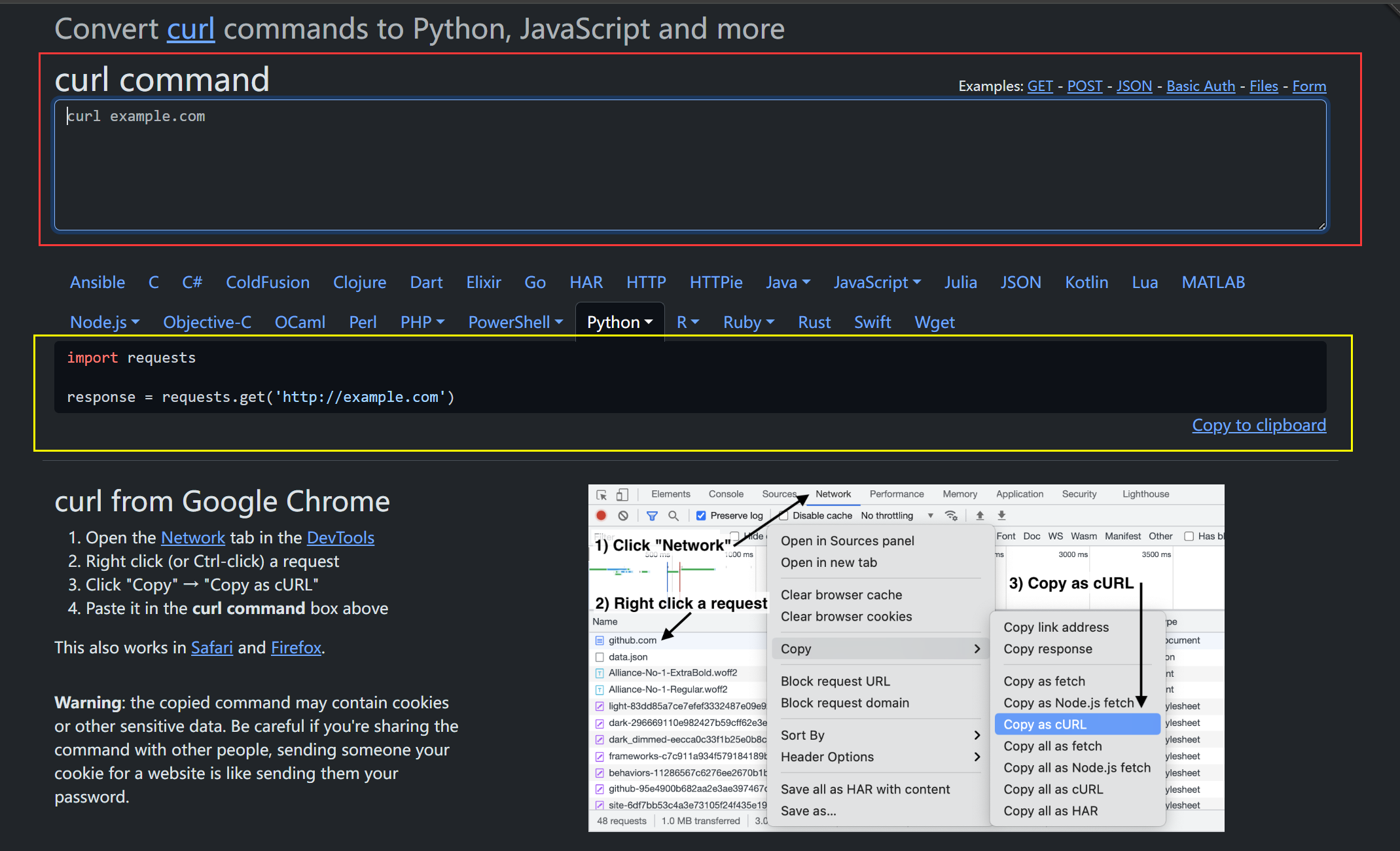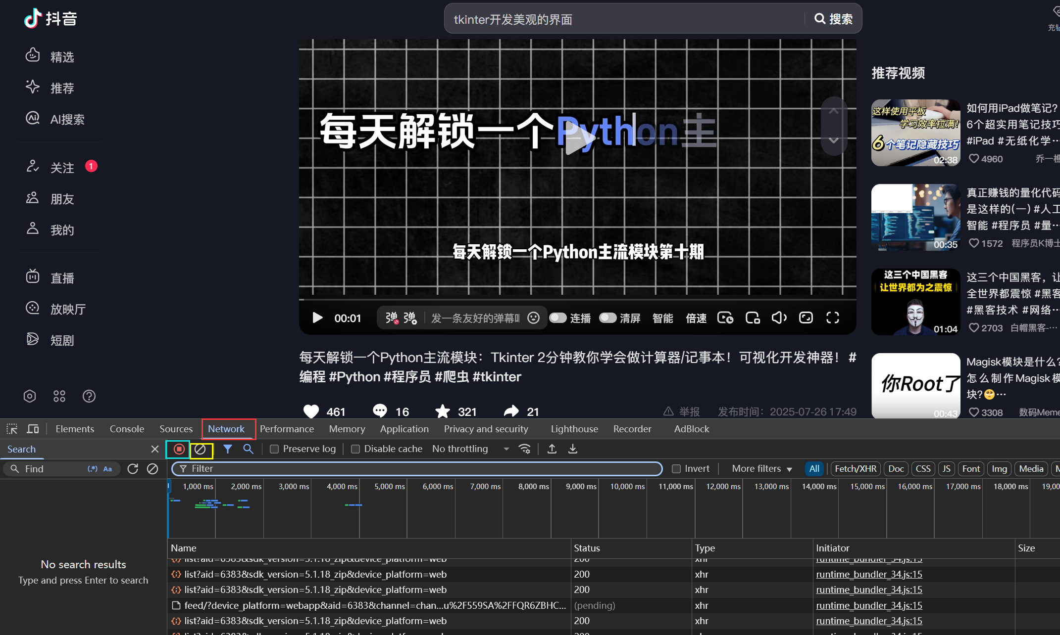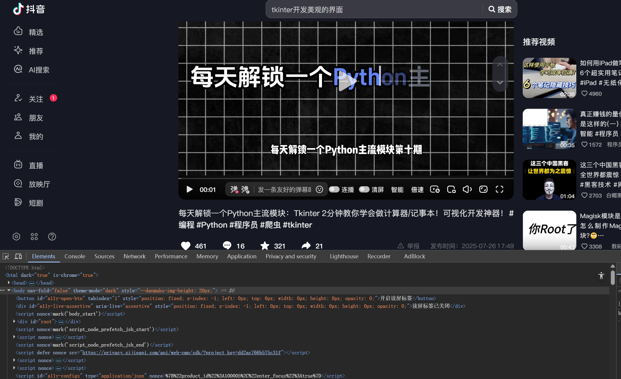 继续右键单击这条响应数据,找到Copy,然后找到Copy as cURL(bash),此时我们已经复制了需要传递的参数,然后回到刚才介绍的第三方平台,在红色区域中粘贴刚才复制的参数即可,下方黄色部分会返回给我们Python代码,然后复制这段Python代码,回到开发者工具中,在刚才创建的Python文件中粘贴代码即可(由于这段代码涉及个人数据,就不截图了),然后在抖音中取消我们刚才的点赞再运行文件就可看到点赞成功。
