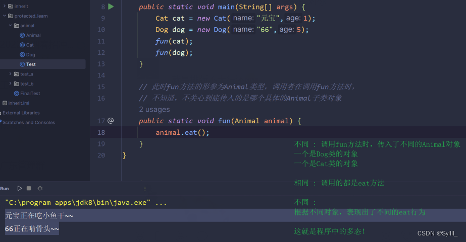 天然发生的向上转型,也是以后产生对象的主要使用方式,语法:父类名称 父类引用 = new 子类实例();1.到底通过这个父类引用能调用哪些属性和方法,看父类中有哪些属性和方法,父类引用决定了能调啥东西,2.至于调用的这个方法到底表现出什么行为,看到底new的是哪个子类对象。有了向上转型,无论有多少Animal子类,也不管是不是产生新的Animal子类,只要是Animal的子类,统一可以使用向上转型,通过共同的父类引用animal来指向不同的子类对象,fun只需要定义一次,产生新的子类,fun方法丝毫不影响。