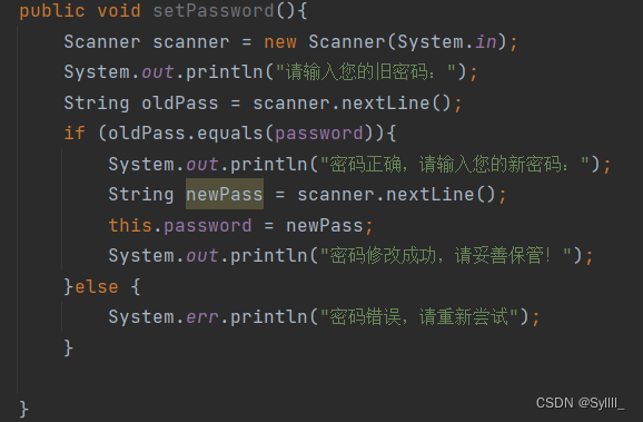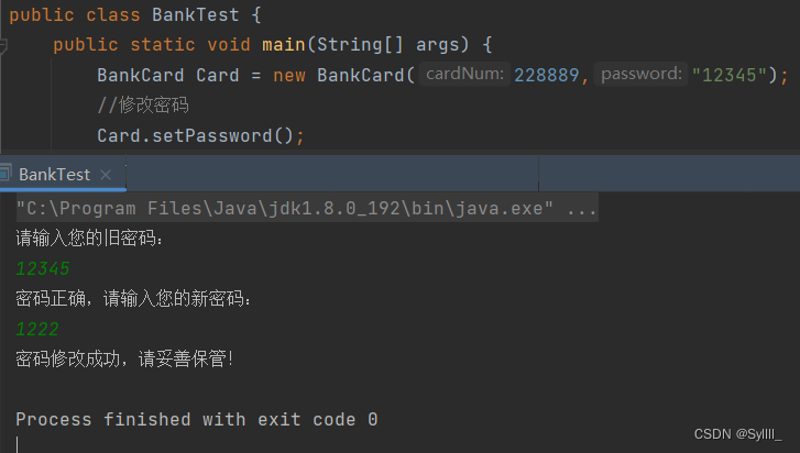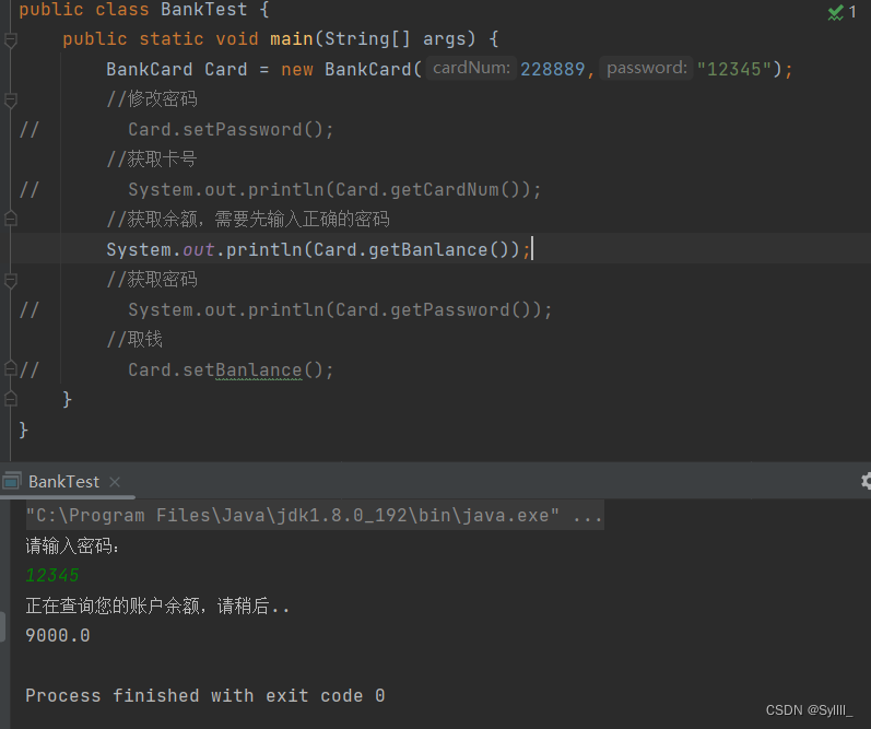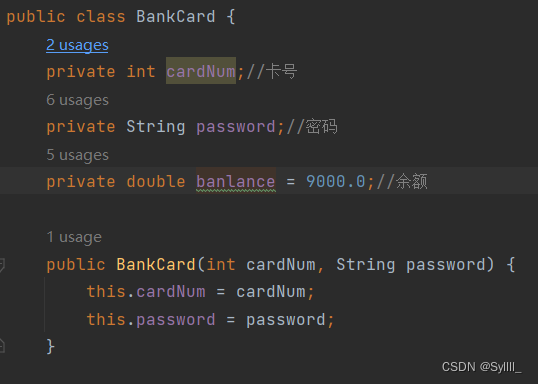 首先是private访问修饰符,它修饰的属性称为私有属性,这些属性只在当前类的内部可见,若我们想要在类的外部取得或者调用私有属性,就要用到getter和setter,例如我们建一个银行卡的类,类中有卡号,密码和余额三个成员变量,我们查询一下余额,修改一下密码,代码如下: