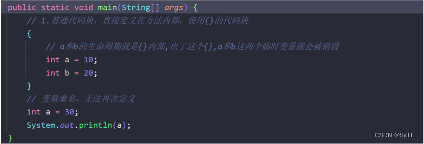 代码块的定义为:使用{}定义的一段代码称之为代码块,根据代码块出现的位置以及关键字的不同,分为以下4种代码块,1.普通代码块:直接定义在方法内部,不加人数修饰符定义的代码,可以解决变量重名问题,代码如下: