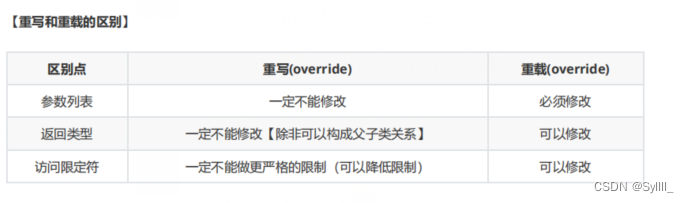 方法重写,在有继承关系的类之间,子类定义了和父类处理权限不同以外,其他(方法名称,参数列表,返回值类型(向上转型除外))完全相同的方法称为子类重写了父类的方法,子类重写方法的权限 >= 父类方法,方法重写与方法重载基本是完全相反的东西,二者的区别如下: