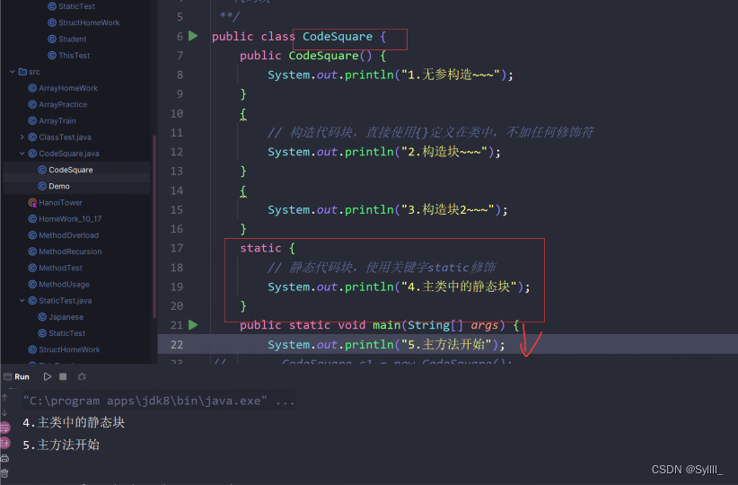3.静态块:一般用于初始化静态变量,特点为:静态代码块在类加载时执行一次,与具体产生对象无关,若有多个静态块,按照代码的书写顺序依次执行,代码如下: