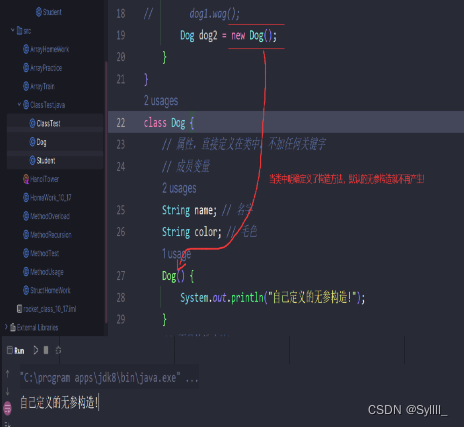 在new后面跟的类名称(),是为了产生Dog对象,而产生Dog对象就需要调用构造方法,这个方法不需要你去写,在产生对象时会自动在class文件中生成,构造方法是为了给对象的属性做初始化操作,就是给对象的属性赋其属性的数据类型所对应的默认值。