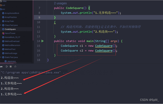 2.构造块:直接定义在类中,使用{}的代码块称之为构造块,代码如下: