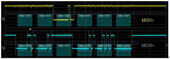 在力科示波器界面下进入菜单项“Analysis”->”Serial Decode”->”SPI”,用户对总线正在传输的数据内容进行实时解码,解码后的内容能选择以“二进制”、“十六进制”和“ASCII”三种方式直接显示在波形上方。例如图4中的信息,MOSI上的第二个0x05,表示RDSR,查看读状态寄存器,MISO上随即返回0x02,表示该设备是可写的,且处于空闲状态。