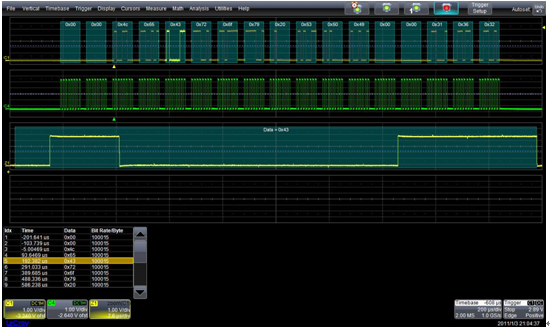 除了可以直接在波形上显示解码结果以外,力科还提供了列表显示解码结果。例如图5中的信息,列表显示了解码后该字段的相关信息,可以通过点击列表的某一行来放大该段数据以观察波形细节。