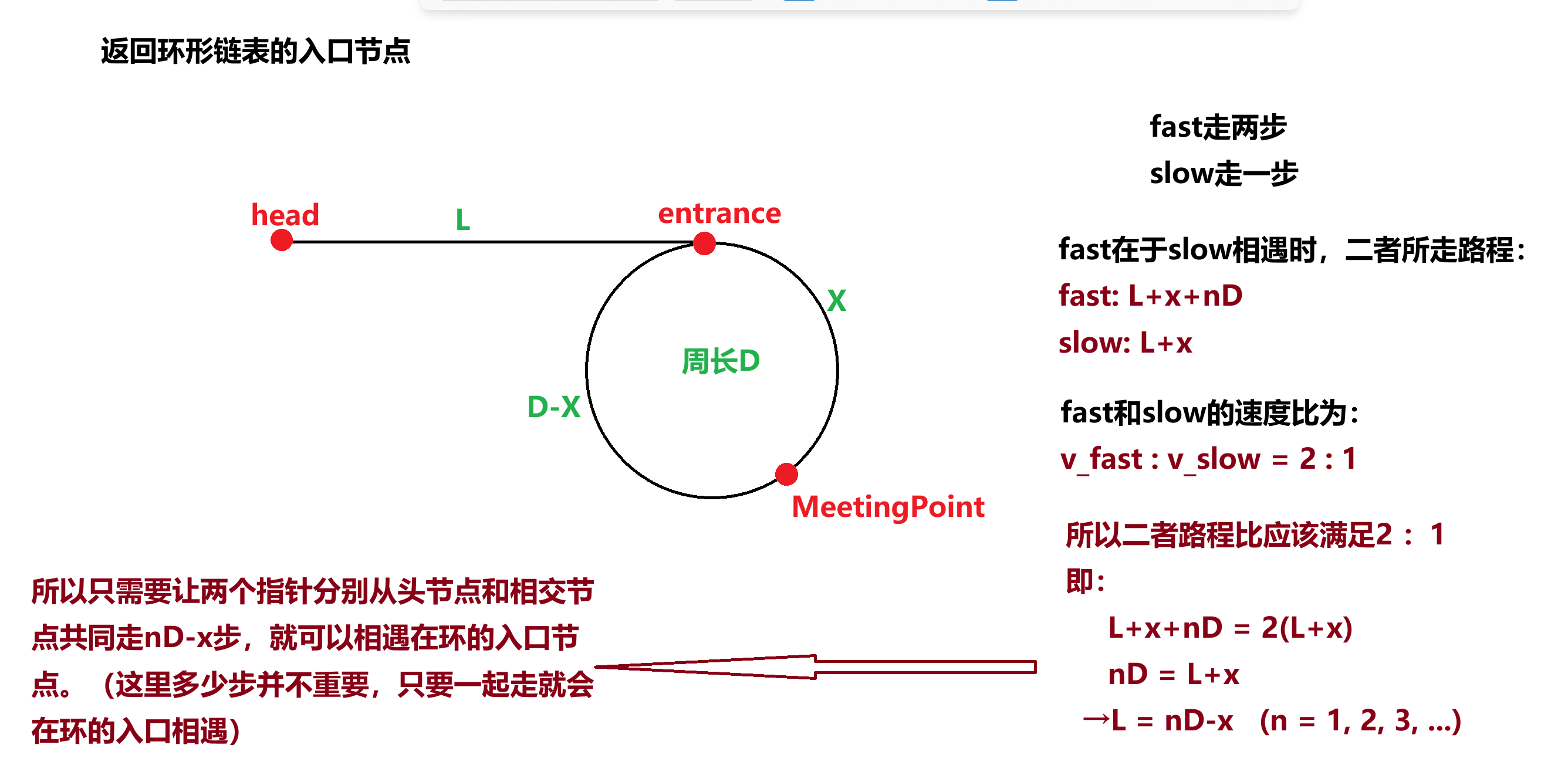 2.头节点和相交点同时开始走,最后会交于入口点。