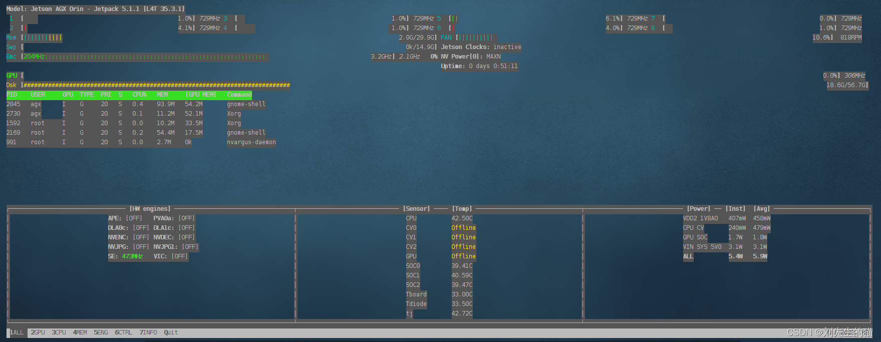 在这个界面就可以实时看到系统的运行状态(CPU、GPU、风扇转速、显存、Jetpack版本信息等)