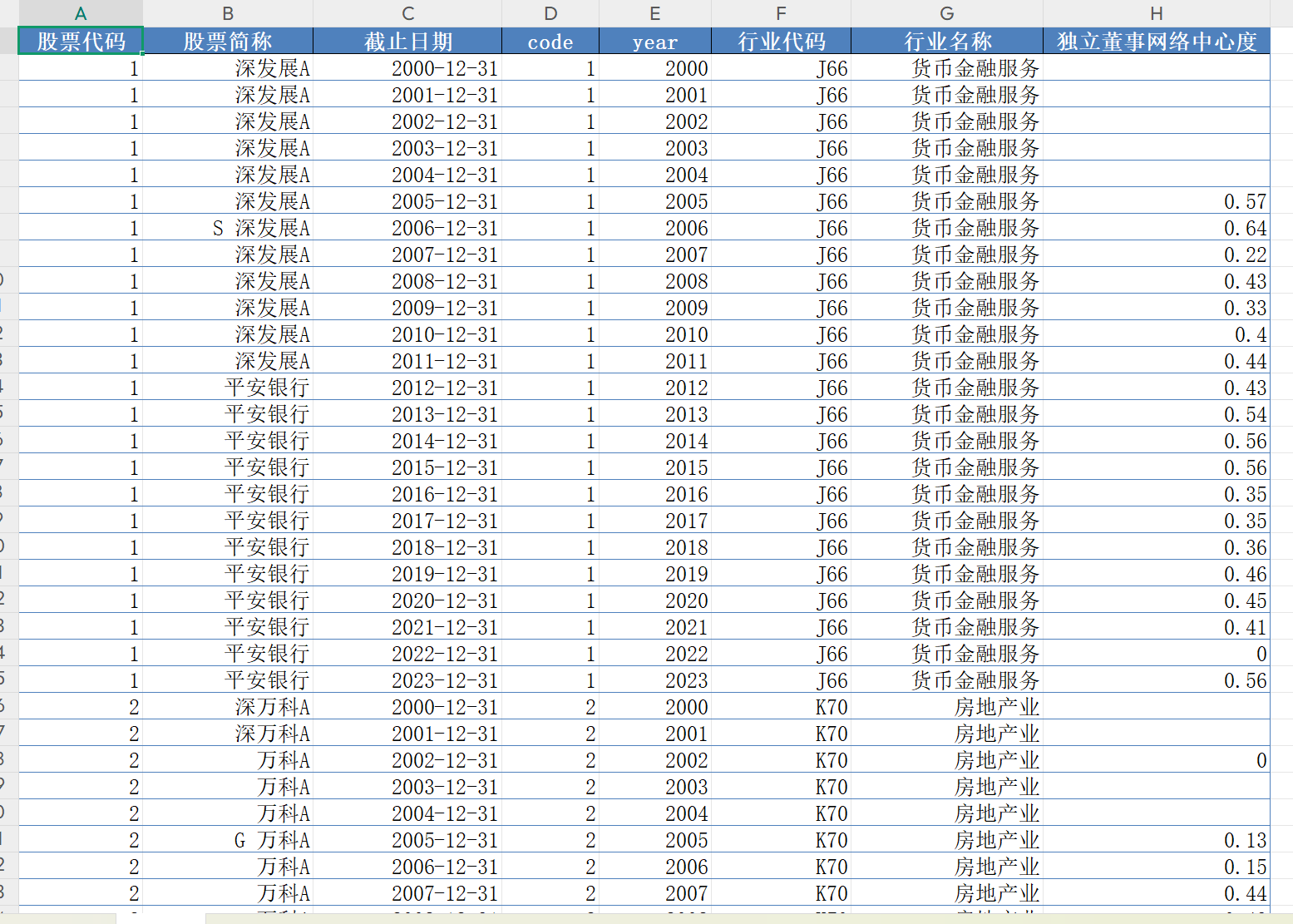 | 股票代码 | 股票简称 | 截止日期 | code | year | 行业代码 | 行业名称 | 独立董事网络中心度 |