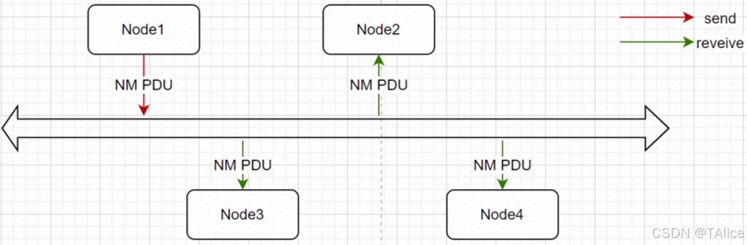 - 每一个CanNm节点(ECU)连接在一个共用的集群总线上,每个CanNm节点的收发会以广播的形式,即发送PDU给集群总线上的所有结点,接收集群总线上所有发出来的PDU(广播收发)