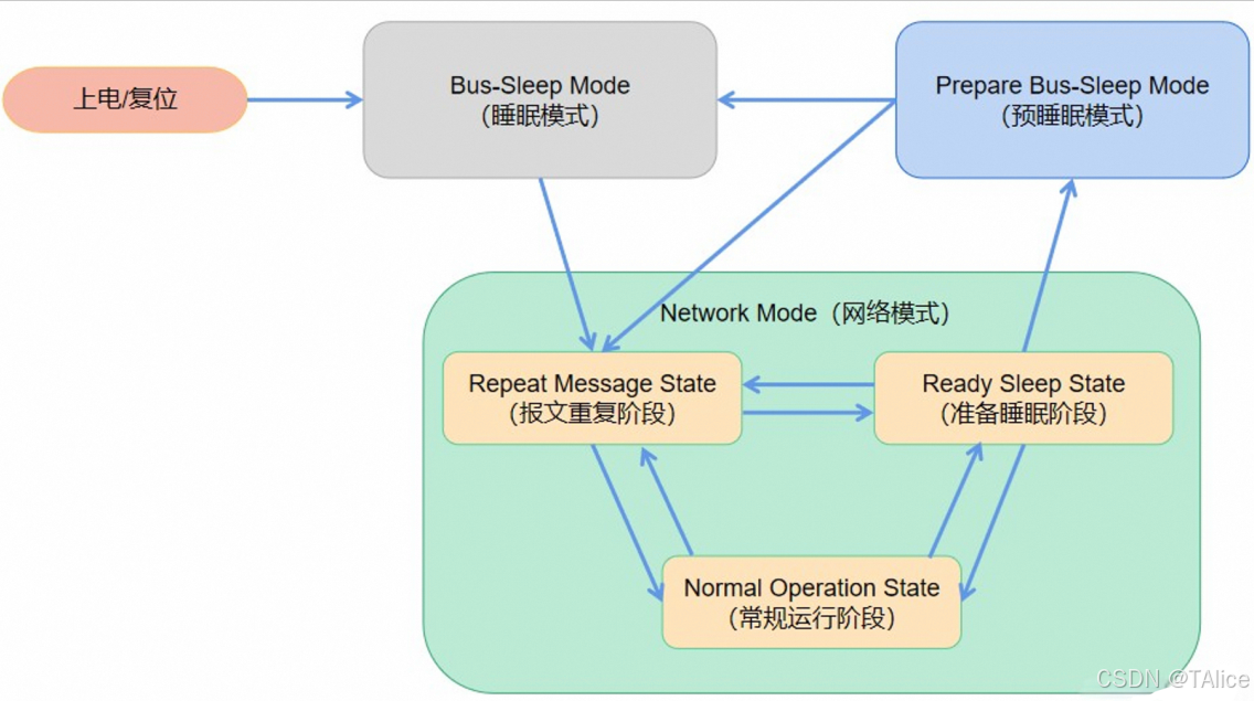 - 如果CanNm集群总线上的某一个节点没有收到PDU,则它会启动一个定时器来检测是否需要进入总线休眠模式,在该过程中,该结点只收不发,如果收到PDU,则该结点会推迟进入总线休眠模式(准备总线睡眠模式,只收不发)