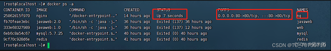 5、这时候大家可以使用docker -ps -a,来查看自己的容器是否已经运行!