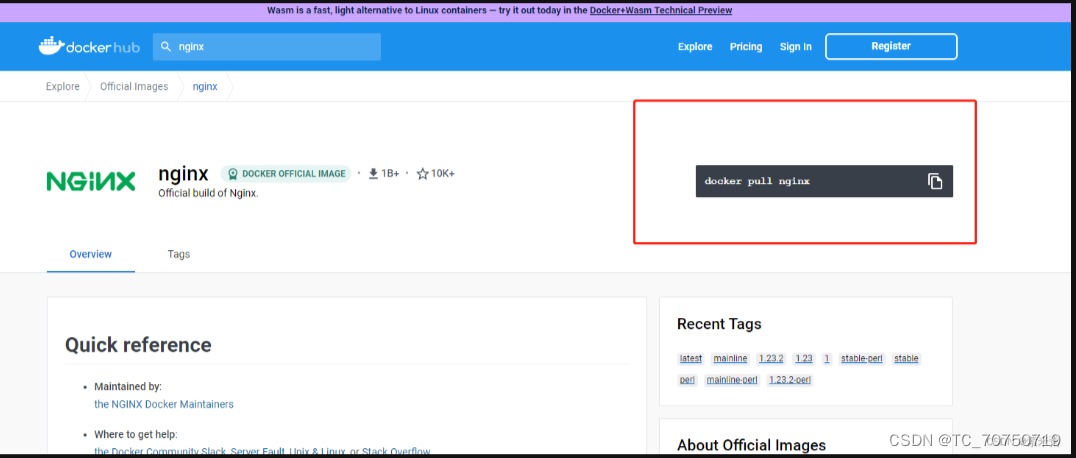 2、其次登录DockerHub官网,然后搜索nginx,,然后在虚拟机里面输入docker pull nginx,就可以下载nginx的镜像了。