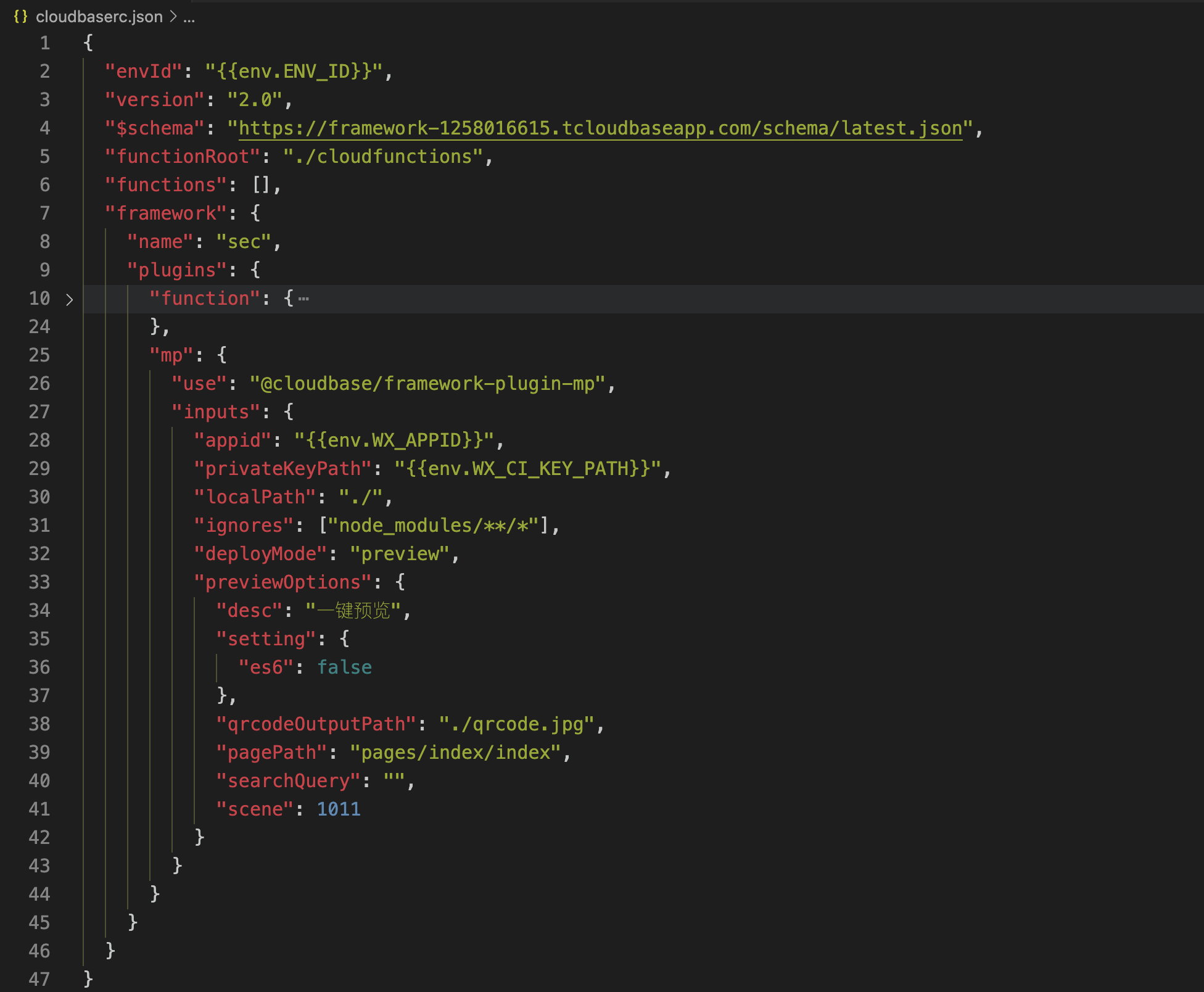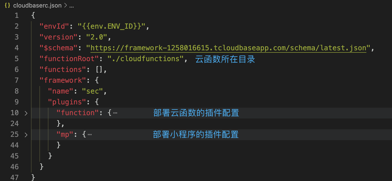 步骤二:配置cloudbaserc文件 项目的根目录中,有cloudbaserc.json文件,这是CloudBase-FrameWork工作的保障和依据。